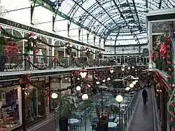 The design of the building is typically Victorian, with a domed and barrel-vaulted glass roof, supported by decorative iron work, with some stained glass windows and mahogany shop fronts that have been virtually unaltered since the day the arcade opened. There are at least thirty shops which are spread over two floors in the arcade.[3] The upper shopping level features balconies that stretches the majority of the building's length, which can be accessed from three staircases in the arcade.