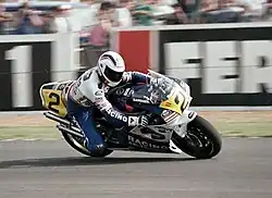 Gardner's impressive results on the Moriwaki Kawasaki eventually earned him a contract with the Honda Britain racing team. He rode a Honda to a fourth-place finish in the 1982 Formula TT championship.[9] Gardner made his 500 cc Grand Prix debut with the Honda Britain team at the 1983 Dutch TT during which he was involved in an accident with reigning world champion, Franco Uncini.[6] Uncini fell off his bike as he was exiting a corner and as he tried to run off the track, he was struck on his helmet by Gardner's bike.[6] Uncini went into a coma but, subsequently recovered from his injuries.[6] Gardner failed to score any points in the two Grand Prix races he had entered in 1983.[2] In 1984, he won the British 500cc national championship for Honda and was able to compete in five Grand Prix world championship races.[2][6][10] He scored points in all five of the Grand Prix races in which he was able to compete in during 1984, including an impressive third-place finish at the Swedish Grand Prix, earning a seventh place in the final championship standings.[2]