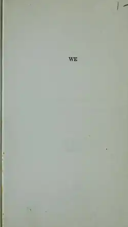 We (Russian: Мы, romanized: My) is a dystopian novel by Russian writer Yevgeny Zamyatin (often anglicised as Eugene Zamiatin) that was written in 1920–1921.[1] It was first published as an English translation by Gregory Zilboorg in 1924 by E. P. Dutton in New York, with the original Russian text first published in 1952. The novel describes a world of harmony and conformity within a united totalitarian state that is rebelled against by the protagonist, D-503 (Russian: Д-503). It influenced the emergence of dystopia as a literary genre. George Orwell said that Aldous Huxley's 1931 Brave New World must be partly derived from We,[2] although Huxley denied this. Orwell's own Nineteen Eighty-Four (1949) and Animal Farm were also inspired by We, as are many other contemporary dystopian novels.[3]