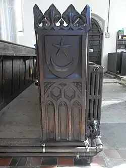 The Trewin (or Treawyn, etc.) family, alias "de Weare", are said to have used fishes as an heraldic device, in reference to the fish-weir within the manor and such devices are sculpted on the spandrels of the western arch of the western porch to the Hall.[5] The arms of William Trewin alias Weare (d. 1421) are shown in the 4th quarter of the escutcheon on the monumental brass depicting Richard Fortescue (d. 1570) in Filleigh Church: Argent, on a bend vert between six crosses crosslet fitchee gules three crozier heads or.[6]