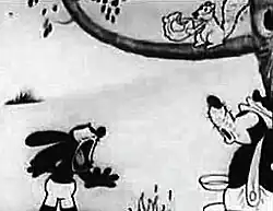 When the bear is about to take a bite of the roasted chicken, the cop, approaching from behind, swipes it in the blink of an eye. The surprised bear then looks around and notices the cop pointing a gun at him. He too flees. As they walk away together, Oswald and the bear point fingers at each other over not having to eat anything. Meanwhile, the cop carries the roasted chicken and puts it back on the window sill. Just then, the dog, watching from one of the house's corners, thinks another act of pilferage is taking place. In this, the dog chases the cop down the road, passing by Oswald and the bear who are enjoying the incident.