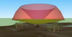 Due to the Earth's curvature and change of index of refraction with height, the radar cannot "see" below the height above ground of the minimal angle (shown in green) or closer to the radar than the maximal one (shown as a red cone in the center).[19]