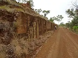 Work started on the 3-foot-6-inch (1.07 m) railway in early 1913, supervised by Ainscow. MacGregor Junction (Devoncourt), on the Malbon to Sulieman Creek railway, was the location of the main construction camp. The steepest grade for the railway was 1 in 40, with a minimum curve radius of 5 chains (330 ft; 100 m). By April 1913 about 200 men were employed on the project.[59] By April 1913, all formation works and cuttings were finished to the Malbon River, 5 miles (8 km) northwest of MacGregor Junction, which by then had a telegraph office, a general store, slaughter yards, butcher and baker.[60][1]