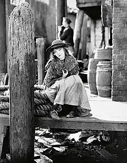 D. W. Griffith has been described as the "master of the silent melodrama", as he established its stylistic features in films like Hearts of the World (1918), Broken Blossoms (1919), True Heart Susie (1919), Way Down East (1920) and Orphans of the Storm (1922), in which the "sociosexual trials and tribulations of the sisters [Lillian Gish and Dorothy Gish] et al. were communicated in theatrical pantomime."[44] Griffith employed various cinematic techniques to highlight the characters' "virtuous suffering": extended camera shots, a measured storytelling pace, repeated close-ups of the distressed heroine (often with eyes turned upwards), and a solemn musical accompaniment.[44]