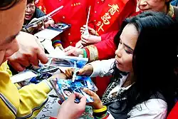 In 2012, she attended a charity auction in Beijing alongside her three children to auction a dress she wore during her performance at the 2008 Beijing Olympics. It sold for a record CNY ¥300,000 (US$42,800), and all proceeds were donated to charity.[85] In the same year, she was also appointed China's Oceanic Goodwill Ambassador by the China's Ministry of Natural Resources.[86]