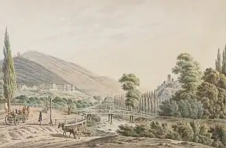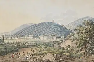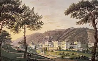 Shortly, after the marriage he decided to construct a summer residence as a present for his wife.[1] The location for the palace was in Baden near Vienna, a spa town favoured by the Viennese elite and members of the imperial family, who constructed extensive villas nearby.[3][4] The chosen plot was at the entrance of the Helenental valley, at the foot of a hill dominated by the ruins of Rauheneck castle and opposite the ruins of Rauhenstein castle. The land was owned by the Doblhoff family, who sold it to the archduke.