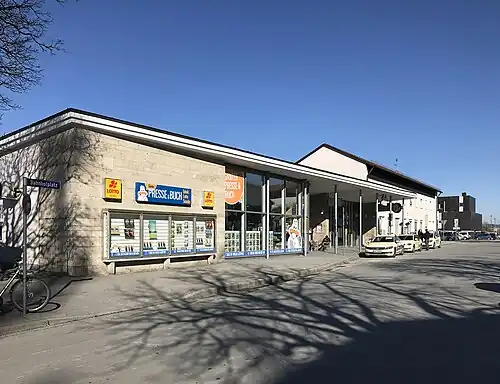 In the postwar period, the ruins of the old station building was demolished and a new building was built in its place, which is still in operation.[5] The station building is a long two-story building with an asymmetrical gable roof, connected to the south and north to single-storey buildings with flat roofs. The two-story part of the building includes the operations room, a single-storey annex to the south, which houses the waiting room with access to the platform subway and some shops and a DB travel centre.