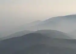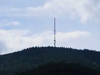 ![]() The Weinbiet in 2008 seen from the Mußbach. The panorama tower (left, small antenna) is almost entirely hidden by trees due to its relative proximity (3 km). | |