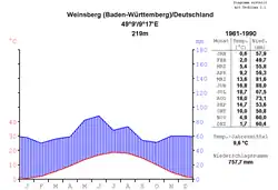 According to meteorological data of the viticulture school the average yearly temperature in Weinsberg increased from 1900 to 2006 from 9.2 °C (49 °F) to 10 °C (50 °F).[11]