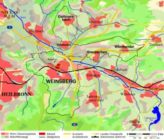 The town of Weinsberg covers 22.22 km2 (8.58 sq mi), about 13.95 km2 (5.39 sq mi) of which are allotted to Weinsberg, 3.36 km2 (1.30 sq mi) to Gellmersbach, 2.10 km2 (0.81 sq mi) to Grantschen and 2.79 km2 (1.08 sq mi) to Wimmental (conditions: June 2006).[4]