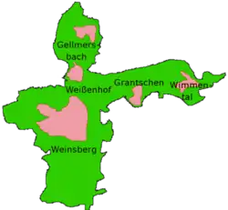 Except from the town itself, Weinsberg consists of the incorporated localities of Gellmersbach, Grantschen and Wimmental. Outside of the closed land development are the places Weißenhof (with clinical center), Rappenhof and Stöcklesberg belonging to Weinsberg, without it dealing thereby with own localities. Gone off no longer existing places on Weinsberg's communal land are Bodelshofen, Burkhardswiesen (or Burchardeswiesen), Holßhofen, In dem Gründe, Lyndach, Uff the Wier and Wolfshöfle.[8]