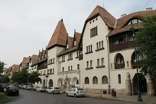 The main, central square was very important for the concept of "building for the community", thus planning of the main square was a separate project, won by Károly Kós one of the star architects of the period. He designed the arrangement with the radial street layout and also one of the trademark wooden gates (the eastern one). Many of the famed architects of the era (e.g. Lajos Schodits, Béla Eberling, Dezső Zrumeczky, Gyula Wälder and Dénes Györgyi) designed houses on the square.