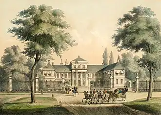 The site of the palace of previously occupied by another palace, Schloss Monbrilliant.[1] This palace dated from the first half of the 18th century,[1] and served as a summer residence of kings Ernest Augustus (1771–1851) and George V.[1] Before construction of the new palace commenced, the old palace was demolished,[1] and rebuilt in Georgsmarienhütte before finally being torn down in 1923.[1]