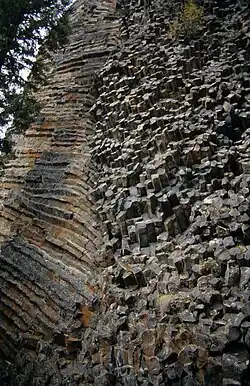 At the end of the last ice age approximately 10,000 years ago, massive floods from the melting glacial ice carved deep canyons into the underlying plateau-capping lava flows.[4] Most of these canyons contain rivers such as the Murtle and Clearwater, and waterfalls such as Canim Falls, Moul Falls, Spahats Falls and the 141 m (463 ft) high Helmcken Falls.[4] The faces of the basaltic lava flows and waterfalls remain vertical due to the nature of the basaltic lava flows.[4] Basaltic lava shrinks as it cools and forms vertical columns of rock called columnar basalt.[4] More recently, the southern end of the volcanic field has experienced continuous volcanic activity since the end of the last ice age. This volcanic activity occurred in three areas; Spanish Creek, Ray Lake and Kostal Lake which were followed by lava fountain eruptions creating cinder cones and lava flows.[6]