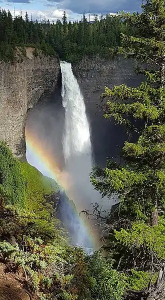The southern third of Wells Gray Park is traversed by the Clearwater Valley Road, although large areas are accessible only by trail. The dominant topography features volcanic plateaus, lava flows and deep canyons which are crowned by several peaks over 2,300 m (7,546 ft) high. The waterfalls, for which Wells Gray is famous, usually result from the interaction of volcanic eruptions and glacial activity. The best known is Helmcken Falls, the fourth highest waterfall in Canada, which plunges 141 m (463 ft) over the edge of one of these volcanic plateaus.[4]