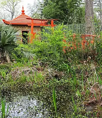 The garden contains two ponds, concrete bridges in a Japanese style, torii, a teahouse, and a variety of indigenous and exotic flora including lotus, Japanese iris, water lilies, crepe myrtle, dogwood, and cypress.