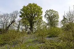 Trees in this site are managed by rotational coppicing, and include ash, hazel, sweet chestnut and the rare small leaved lime. It is carpeted by bluebells in the spring, and there are other flowers such as yellow archangel and wood anemone. Dead wood provides a habitat for stag beetle larvae.[3]