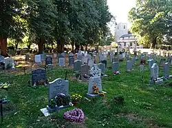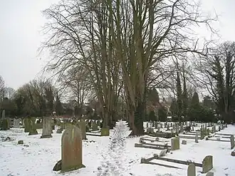 The village church, the Prebendal Church of St Mary, was originally Norman, but only a few fragments of this survive in the tower walls; the present building is in the Early English style from around 1250.[35] Apart from the pillars and arches within the church, most of the church is not the original Norman one. After it burnt down in 1442, the tower was rebuilt in 1768[c] and the body of the church in 1823 and 1824.[5][36] The large cemetery to the south and east has likely been in use since as long as the church, though most graves from earlier than the 1700s have been lost to time, with tragically few surviving from even as far back as that.[37] The choir vestry was added onto the north side in 1921 in memory of Bishop Edward King. Above and behind the baptismal font, on the west wall of the tower, hang the hatchments, the Royal Coat of Arms of King George III, dated 1838, which interestingly, in the year after William IV's death and Victoria's accession, do not carry the name of the monarch.[36] Below the arms is an oil painting of the Holy family by Florentine artist Carlo Falcini Depinse, dated 1847, given to the church in 1925. Until its removal in 1876, there was a gallery up against the west wall, which would have been used by the orchestra to provide music for the services until 1851. The box pews were removed in 1888 and 1890, at the same time as the chancel was refitted, replaced with pine benches which now seat 250.[5][4] The total cost of all these improvements came to £613.[17]