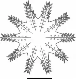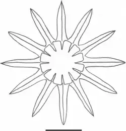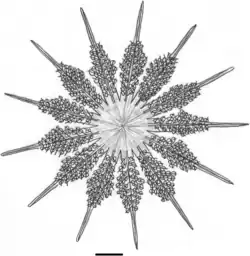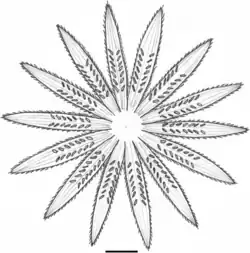| Weltrichia spectabilis | England | Middle Jurassic | Central cup 40 mm in diameter and rays 30-50 mm in length, which bear apical filiform whiskers, which can reach 30-60 mm in length.[1] Has been suggested to be synonymous with Weltrichia pecten and Weltrichia whitbiensis.[2] | ![]() |