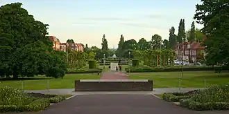 The town is laid out along tree-lined boulevards with a neo-Georgian town centre.[6] It has its own environmental protection legislation, the Scheme of Management for Welwyn Garden City.[7] Every road has a wide grass verge. The spine of the town is Parkway, a central mall or scenic parkway, almost a mile long. The view along Parkway to the south was once described as one of the world's finest urban vistas.[8] Older houses are on the west side of Parkway and newer houses on the east side[6]