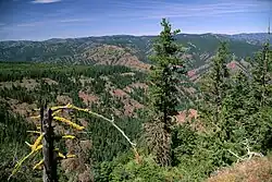 In 2015, the Grizzly Bear Complex fire burned almost 83,000 acres (34,000 ha), including a large area in the Wenaha watershed. Previous wildfire suppression had left the area overstocked and "extremely vulnerable to catastrophic wildfire." Following the fire, the Washington Department of Fish and Wildlife began forest thinning and remediation efforts in the Grouse Flats area.[48] The Forest Service worked to stabilize damaged trails and facilitated salvage logging of timber from the burned area. The destroyed Crooked Creek bridge along the Wenaha River Trail was removed,[49] but would not be rebuilt until the summer of 2023.[50]