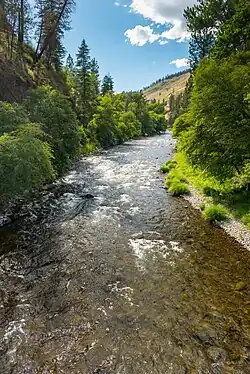 The Wenaha River is considered a Type IV channel under the Rosgen Stream Classification, characterized by a shallow rocky bed interspersed with deep pools.[3] Although the river flows through a rugged, mountainous region, its gradient is relatively low at 1.1 percent, and is bordered by floodplains with dense riparian hardwood forests along its valley floor.[25] These characteristics contrast with the nearby Grande Ronde and Snake Rivers, which have steeper gradients and less floodplain area.[26] There are no dams or channel modifications on the Wenaha River and its tributaries; although there are a few water rights within the basin used for domestic and livestock water supply, they account for a tiny portion of the river's flow.[3] The river is considered a critical habitat for spring chinook salmon, steelhead trout and bull trout (formerly considered the same as Dolly Varden trout).[26] The Forest Service reported in 2000 that "the Wenaha River system may be one of the best bull trout populations remaining in Oregon."[27]: 3–52  Other fish species include rainbow trout, redband trout, and mountain whitefish.[3]