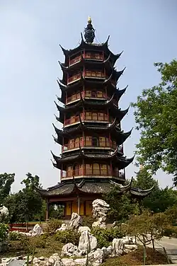 Wenbi Tower (Chinese: 文笔塔) is a tower in Changzhou, China, located near Hongmei Park. It was built during the Southern Dynasties, Qi Gaozu, Xiao Daocheng (萧道成), Jianyuan (479-482), and first named Jianyuan Temple.[1] Later, it was changed to Peace Tower. Because the tower looks like a pen, people changed the name into Wenbi Tower. As time went on, the temple had been deteriorated because of wars, natural disasters and the Cultural Revolution. Not until the Chinese economic reform did Liu Biru, a Chinese-American, subsidized restoration of the temple in 1982.