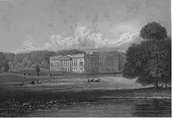 Bodt's use of a giant order of pilasters on the front and other features, suggested to John Harris that Bodt, who had been in England in the 1690s, had had access to drawings by William Talman. Talman was the architect of Chatsworth, considered to be England's first truly Baroque house. Indeed, there are similarities of design between Wentworth's east front and Chatsworth. Both have a distinctly Continental Baroque frontage. Wentworth has been described as "a remarkable and almost unique example of Franco-Prussian architecture in Georgian England".[13] The east front was built upon a raised terrace that descended to sweeps of gravelled ramps that flanked a grotto and extended in an axial vista framed by double allées of trees to a formal wrought iron gate, all seen in Jan Kip's view of 1714, which if it is not more plan than reality, includes patterned parterres to the west of the house and an exedra on rising ground behind, all features that appear again in Britannia Illustrata, (1730).[14] An engraving by Thomas Badeslade from about 1750 still shows the formal features centred on Bodt's façade, enclosed in gravel drives wide enough for a coach-and-four. The regular plantations of trees planted bosquet-fashion have matured: their edges are clipped, and straight rides pierce them.[15] All these were swept away by the 2nd Earl after mid-century, in favour of an open, rolling "naturalistic" landscape in the manner of Capability Brown.[16]