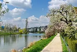 Limmatauen Werdhölzli is a protected forest and river area, partially situated in the municipality of Oberengstringen, between the weir at the Höngg power plant, resulting in a more than 130 years old flood protection plan between two neighbored municipalities. Set under protection in 1945, the 1.8 kilometres (1.1 mi) long section of the Limmat was renatured, what enhanced the biodiversity, and thus the quality of the river landscape.[5] In cooperation with the Canton of Zurich, the municipalities of Oberengstringen and Zürich, that section of the river was renewed to September 2013. In addition to improved access to the Limmat and the hiking path towards the Fahr Abbey, the area was widened for pedestrians and cyclists. Orientation boards inform on the endemic flora and fauna, so the riparian zone may be crossed over a 320 metres (1,050 ft) long wooden bridge those material consists of the urban forests, and allows to discover with open eyes and senses what lives and grows here. Along the ridge, there are installed bat boxes in the trees. After nearly a year of construction, the project was officially presented to the public on 20 September 2013. The costs of 9.4 million Swiss Francs, are provided by the city and cantonal government, and some companies in collaboration with the World Wildlife Fund Switzerland, which claims the place as very important to our rivers and streams, so that they can create their very structure.[6][7]