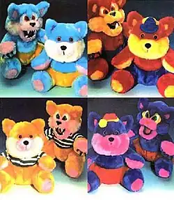 The WereBears were a series of teddy bears released in 1983 in the United Kingdom. They were created by George Nicholas, a muralist and managing director with Impact Murals, philanthropist and director of his charity Art For Their Sake, cartoonist, animator, and author, so that boys could have teddy bears without worrying about being bullied. Nicholas gave the handling of distribution of the toys to UK-based toy company Hornby.[1] The bears were designed in a way that their "normal" head functioned as a hood, and by turning the head inside out it would reveal the "were" face.
