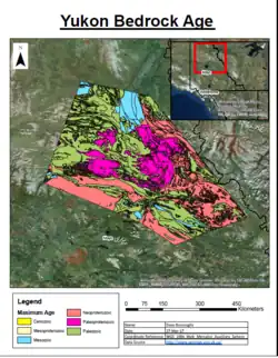 The Yukon's crystalline basement is overlain by thick sedimentary strata deposited in extensional and/or rift basin environments.[3] These basement rocks are not exposed anywhere in the Yukon, and the thickness of the surpracrustal sediments makes surveying using aeromagnetics, a technique used for inferring basement character in NWT, difficult.[5] Hence, the character of the underlying crystalline basement of the Wernecke range is not well-known.[5] Estimates for the age of the basement rock ranges from Archean to early Proterozoic.[3][5] These rocks are hypothesized to be a thinned continuation of the granitic Fort Simpson terrane exposed to the East based on aeromagnetic and gravity anomalies combined with drill-hole analyses in NWT.[3][5]
