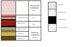Windermere Supergroup was deposited on an angular uniformity over the Hematite Creek Group. Using isotopic ages of volcanic rocks emplaced before sedimentation began as well as correlations with sediments on other continents, the beginning of the Windermere Supergroup can be dated at 780 Ma.[12][6] The Windermere sedimentary deposits formed in a rift or passive margin environment. In contrast to the sediments deposited before, the Windermere Supergroup shows glacially deposited sediments as well as clastic-carbonate grand cycles.[7][6][12] The Windermere strata have been correlated to outcrops along the entire North American west coast.[12] This supergroup is composed of two main subgroups, the Rapitan Group and an upper package sometimes referred to as the Hay Creek group.[6] The Rapitan Group consists of glacial related sediments where as the Hay Creek Group consists of more typical clastic-carbonate grand cycles.[12]