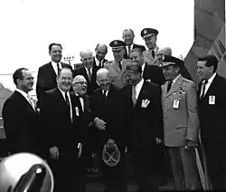 In 1960, his group was assimilated into NASA, where he served as director of the newly formed Marshall Space Flight Center and as the chief architect of the Saturn V super heavy-lift launch vehicle that propelled the Apollo spacecraft to the Moon.[8][9] In 1967, von Braun was inducted into the National Academy of Engineering, and in 1975, he received the National Medal of Science.