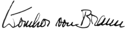 His father, Magnus Freiherr von Braun (1878–1972), was a civil servant and conservative politician; he served as Minister of Agriculture in the federal government during the Weimar Republic. His mother, Emmy von Quistorp (1886–1959), traced her ancestry through both parents to medieval European royalty and was a descendant of Philip III of France, Valdemar I of Denmark, Robert III of Scotland, and Edward III of England.[15][16] He had an older brother, the West German diplomat Sigismund von Braun, who served as Secretary of State in the Foreign Office in the 1970s, and a younger brother, Magnus von Braun, who was a rocket scientist and later a senior executive with Chrysler.[17]