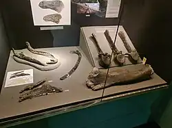 A notable feature of the formation are the so-called "plant debris beds". These consist of a basal matrix supported conglomerate, grading upwards into grey mudstone with lignitic plant debris, including large trunk fragments of the extinct conifer Pseudofrenelopsis present in the upper portion. These were formed by sheet flood deposits induced by storms that filled pre-existing topographic lows like oxbow lakes and abandoned channels in the floodplain depositional environment.[16] The debris beds do not form a continuous horizon throughout the formation, but are laterally extensive over tens of metres. Many of the wood fragments in the debris beds are cemented together with large nodules of pyrite, suggesting depositional conditions were anoxic.[17] Most fossils within the formation are associated with the debris beds. Vertebrate fossils are mostly disarticulated individual bones and teeth, suggesting a long subaerial exposure prior to burial, though the bones lack abrasion, suggesting that they had not been significantly transported. Partial skeletons also sometimes occur, but are uncommon. Autochthonous siderite nodules are also present, which encase some of the fossils.[16] Plant debris beds also exist within the Swanage section, and one of these horizons has yielded microvertebrate remains.[10]