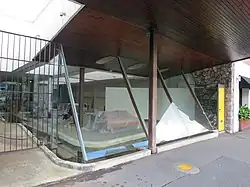 Completed in early 1953, West's Furniture Showroom was "designed with the utmost economy in the contemporary manner".[53] The showroom comprised a rectangular 64-by-34-foot (20 by 10 m) space with a cantilevered, upswept awning that extended over the Wickham Street footpath. The building was predominantly of masonry construction, with a glass shopfront, a concrete floor, and a shallow-pitched, asbestos- and bitumen-lined roof constructed from timber trusses. The roof-top was used as garden area for displaying outdoor furniture and some furniture assembly operations.[54][55][56][57] The existing timber residence was relocated to the rear of the site and converted for use as a workshop for the assemblage and storage of furniture. The workshop enabled access to the roof-top display area, and was level with Knapp Street for the loading of goods to transport vehicles. Its ground floor consisted of a woodwork shop, and the upper floor was designated for polishing and inventory storage.[58][59][60][61] Public access to the showroom was through a single timber door at the northeast end of the Wickham Street shopfront, adjacent to a random rubble stone wall. Projecting from the angled shopfront, the door frame was supported by glass, so that it appeared to float.[1][62]