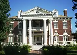 In 1913, the Times announced that the Monarch Hotel was to be built in the "fashionable residence district" of West Adams.[14] By 1916, the Los Angeles Times stated that the area was "already known for its private parks and handsome homes". At that time, improvements to the boulevard were being spearheaded by five prominent residents including Isidore B. Dockweiler, William May Garland and Edward L. Doheny.[15] After convincing thirty-five other residents to help with funding, the old street paving between Figueroa and Hoover streets was replaced with an asphalt surface. Adams Boulevard was now 65 feet wide with a series of center islands planted with flowers, shrubs and mature palms. Six-cluster electroliers, which were duplicates of those that lined Lake Shore Drive in Chicago, were installed on both sides of Adams Street.[15] Adams Boulevard was now a "magnificent concourse" and "one of the most popular drives in Los Angeles".[15]