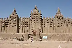 The Mosques of West Africa are mosques located in the region of West Africa that encompasses Benin, Burkina Faso, Cape Verde, The Gambia, Ghana, Guinea, Guinea-Bissau, Ivory Coast, Liberia, Mali, Mauritania, Niger, Nigeria, Senegal, Sierra Leone, and Togo. The architecture of these mosques differ from mosques around the world as they have unique building practices and cultural roles. Islam in Africa spread to the region around the 10th century and established the first written language of West Africa.[1] The spread of Islam into West Africa had impacted scholarship, commerce, and utilized indigenous traditions unique to the area.[1] Sudanese Jihads had formulated their own branch of Islam, establishing powerful Islamic states.[1] Islam is one of the major religions present in Africa, with mosques being architectural spaces used for Muslim worship.