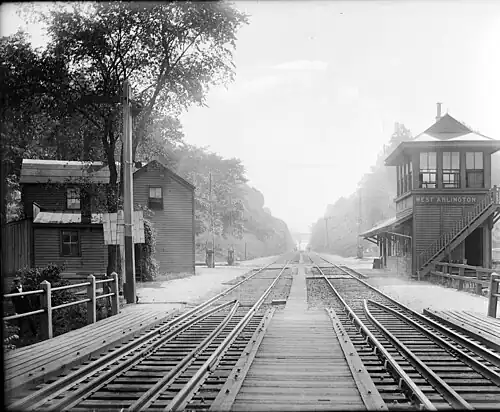 ![]() The former station depot and tower at West Arlington, facing the cut. | |||||||||||