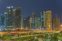 ![]() ![]() ![]() Clockwise from top: view from a boat of West Bay's skyline; dark clouds over the West Bay skyline; and overlooking skyscrapers in the Al Dafna district of West Bay | |