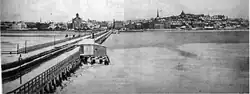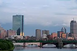 The first river crossing at this site was a ferry, first run in the 1630s.[7] The West Boston Bridge (a toll bridge) was constructed in 1793 by a group of private investors with a charter from the Commonwealth. At the time, there were only a handful of buildings in East Cambridge. The opening of the bridge caused a building boom along Main Street in Cambridge, which connected the bridge to Old Cambridge. In East Cambridge, new streets were laid out and land was reclaimed from the swamps along the Charles River.[8] The Cambridge and Concord Turnpike (now Broadway) was connected to the bridge's western approach around 1812. The bridge became toll-free on January 30, 1858.[9] The first horsecar line in Boston, the Cambridge Railroad running between Bowdoin Square and Harvard Square over the West Boston Bridge, opened on March 26, 1856.[10] The bridge was the primary Boston–Cambridge link for the growing horsecar system, which was eventually consolidated as the West End Street Railway. The Harvard Square–Bowdoin Square line was electrified on February 16, 1889, by the West End - the second of its Boston-area lines to be so equipped.[11][12]