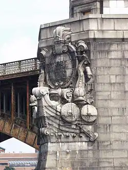 The two large central piers, 188 feet (57 m) long and 53 feet 6 inches (16.31 m) wide,[1] feature four carved, ornamental stone towers. The towers are ornamented with the prows of Viking ships, carved in granite. They refer to a purported voyage by Leif Eriksson up the Charles River circa 1000 AD, promoted at the time by Harvard professor Eben Horsford. The piers are also decorated with the city seals of Boston and Cambridge.
