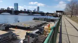 Structural elements on a barge in Cambridge, Massachusetts, waiting to be installed
