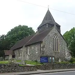 The largely late 12th century church, dedicated to St Peter and St Paul, has later medieval roofs. There is a canonical sundial on the south wall. In the chancel are preserved, in a glass case, some medieval panels of oak; probably late 13th or early 14th-century date; the figures upon them are St. Peter and St. Paul on either side of Saint Thomas of Canterbury; the two apostles bear their respective emblems, the keys and the sword; the martyred archbishop between them has his right hand raised in benediction, while the left holds the cross staff; there are traces of gold on the nimbus of each saint, and the figures are coarsely outlined in black. Much of the pewing in the western part of the nave is nicely carved in dark wood imported from abroad by a former Earl of Onslow.