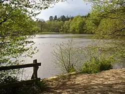 Further east the stream is joined by another small stream on its right bank, rising from springs in Roundwood Gulley, and passes under Soke Road, which at that point briefly follows the course of a Roman road. It also crosses the county boundary into Hampshire at this location. The river continues through the woodland of Benyon's Inclosure, and enters Kiln Pond.[1] An embankment carries a track over the pond, dividing it into two. In 1872, both ponds were fish ponds, but by 1896, only the lower pond, covering an area of 1.637 acres (0.662 ha), was used for this purpose, and the upper pond, covering 1.717 acres (0.695 ha), was marshy ground.[4] By 1969, the upper area was again a pond, covering 4.72 acres (1.91 ha), and there were three sluices to allow water to pass through the embankment, with another sluice controlling the outflow from the lower pond.[5] Just to the south of the pond is The Frith, an Iron Age Hill fort, where a single line of earthworks, which are quite modest in scale, enclose the top of a hill. The enclosure is 520 feet (160 m) by 390 feet (120 m) and there are no records of archaeological excavation being carried out on the site, although parts of it near its entrance have been damaged by tree planting. Silchester Roman Town is located around 0.6 miles (1 km) to the south-east, and the fort may have been associated with the Iron Age town that pre-dated the Roman one.[6]