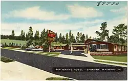 West Hills became a regional transportation hub with the construction of the first automobile bridge over the deep Latah Creek gorge in 1911, when the Sunset Boulevard Bridge was built. It connected Downtown Spokane with agricultural areas to the west via West Hills along Sunset Boulevard.[5] In 1926, the Sunset Boulevard Bridge was chosen to carry U.S. Route 10, one of the first major east–west highways across the northern tier of the country. Numerous motels and campgrounds were developed in the area just west of the bridge at the base of Sunset Hill. A tourist camp was established at what is now High Bridge Park[6] and along Sunset Boulevard itself motels were developed. Many stand to this day, though few remain operational.[5][7] The area's importance in transportation waned in the 1960s as Interstate 90 was constructed roughly parallel to the Sunset Highway. U.S. Route 10 replaced by the limited-access freeway, which passes next to but does not have off or on ramps connecting directly to the motel district. In the decades since, hotels and motels have been developed at the top of the hill, on the western edge of the neighborhood, where there are ramps connecting West Hills to the interstate.[8]