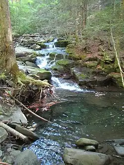 Two streams that later join rise in the cirque between Hunter and Southwest Hunter mountains, amidst the dense forests of the West Kill Wilderness Area, part of the Catskill Park. The source of the northern stream is at 3,100 feet (940 m),[a] the higher of the two. It flows through a narrow groove down the steep upper slopes of the cirque for its first quarter-mile (400 m).[7]