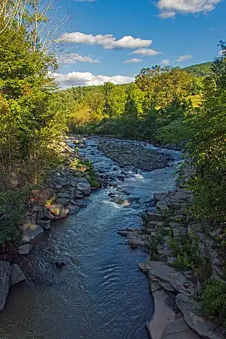 The West Kill, an 11-mile-long (18 km)[2] tributary of Schoharie Creek, flows through the town of Lexington, New York, United States, from its source on Hunter Mountain, the second-highest peak of the Catskill Mountains.[3] Ultimately its waters reach the Hudson River via the Mohawk. Since it drains into the Schoharie upstream of Schoharie Reservoir, it is part of the New York City water supply system. It lends its name to both a mountain to its south and a small town midway along its length.
