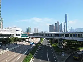 West Kowloon Highway is a section of Route 3 in Hong Kong, built as part of the Airport Core Programme. This dual-three-lane expressway runs for 4.2 km (2.6 mi), connecting Western Harbour Crossing in the south with Tsing Kwai Highway in the north. While the southern section of the road is at grade, the northern part is on a viaduct in order to accommodate the MTR Tung Chung line and the Airport Express.