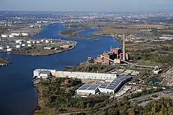 In the 1980s, a string of large office complexes were built along South Avenue, which begins in Mariners Harbor on the North Shore, and ends in Travis; other businesses arrived later, including several hotels, Hilton Garden Inn in 2001, Hampton Inn & Suites in 2007, Comfort Inn and Holiday Inn Express in 2010. A large Con Edison electrical plant stands at the site of the former linoleum factory in Travis, which is also the home of the Teleport, a high-tech industrial park built in the early 1980s, mostly to house companies engaged in the communications industry.[4] In Fall of 2018 the Matrix Global Logistics Park opened in Bloomfield, which is distribution center for companies such as Amazon and Ikea, bringing more than 2,000 jobs and development to the West Shore. In January, 2020 Amazon announced it will expand its footprint on Staten Island, leasing a 450,000 square foot warehouse next to its existing 855,000 sq. ft. fulfillment center.[5]
